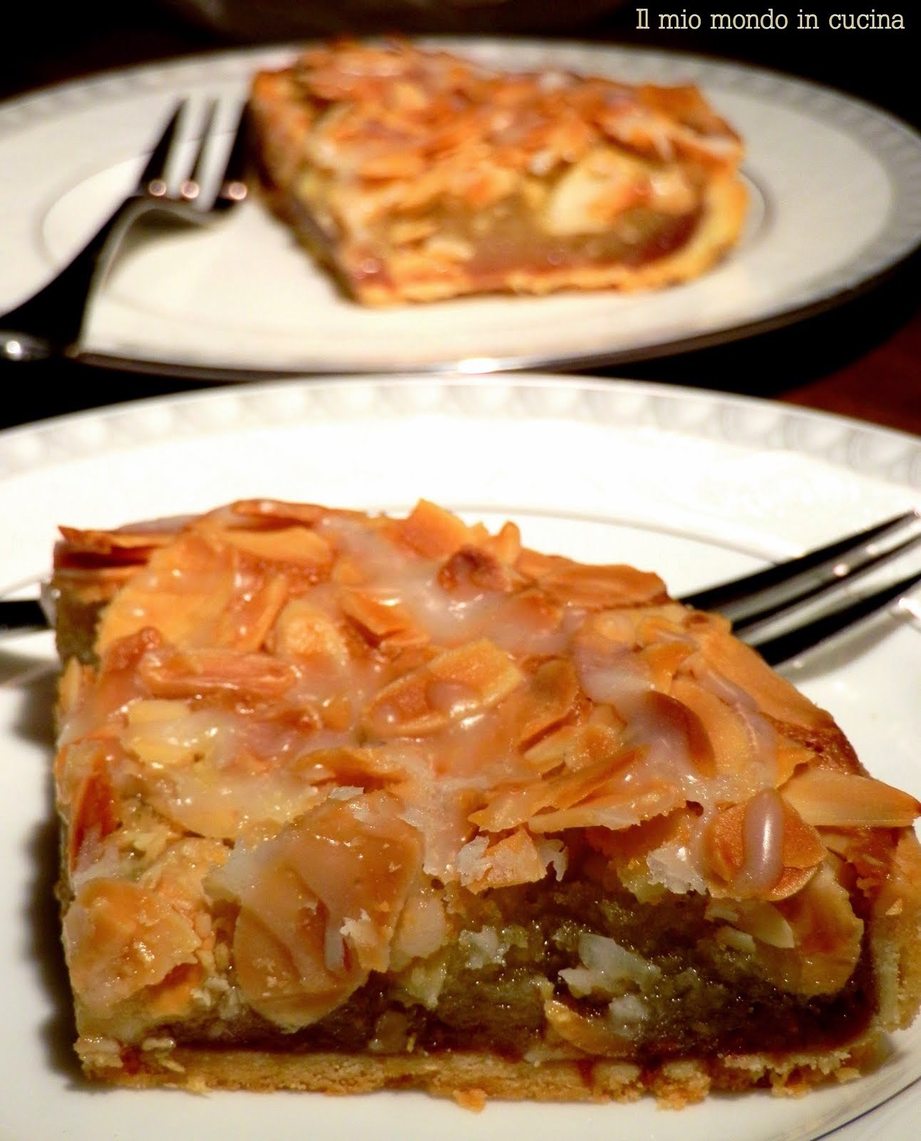 Versare nello stampo il ripieno, pareggiarlo e cospargere con le mandorle a lamelle.