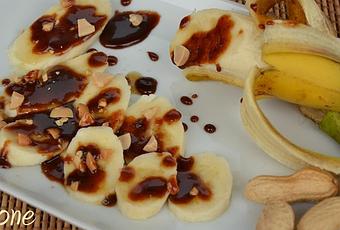 Affettare le banane, disporle in piattini singoli, farcire con il caramello e cospargere con arachidi tritate grossolanamente.