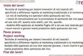 -Mercoledì 14 gennaio 2015, ore 9.30-13.30 e 15.00-19.00 Marketing per una rete teatrale OFF. Lezione con Andrea Maulini (Marketing per lo spettacolo, Milano)