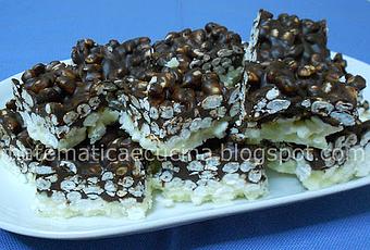 Tenete da parte e preparate l'altro strato sciogliendo, sempre a bagnomaria, il cioccolato al latte e 30 g di burro (e un cucchiaino di miele). Unite il resto del riso soffiato, mescolate e versatelo nella teglia sullo strato bianco che nel frattempo si sarà indurito.