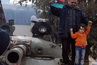 L'ex bandiera libica, risalenti al regno del sovrano deposto da Gheddafi, il re Idris, è in volo sopra gli edifici governativi saccheggiati sul lungomare. Al largo della costa, traghetti passeggeri aspettano nei mari in tempesta di far salire i cittadini stranieri .