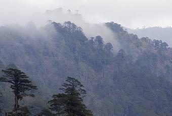 Al valico, la strada si apre in un largo spiazzo, circondata dalle miriadi di aste da cui sventolano gli stendardi nei cinque colori della tradizione e sui quali stanno allineate in una stampa minuta e fittissima i mantra che infinite volte vanno ripetuti per guadagnarsi la liberazione dalle reincarnazioni. Ma è nella collinetta a fianco che il tuo occhio si ferma subito, come ipnotizzato dalla presenza di decine di piccoli chorten bene allineati in una sorta di giardino memoriale a celebrazione di un fatto d'armi di una decina di anni fa. Lo stesso Re ha partecipato, a capo dell'esercito, chiamato a supporto dall'India per sedare una ribellione indipendentista nel vicino Assam. Cinque giorni di guerra, dodici morti, gloria imperitura. Tra le basse costruzioni, il vento spira teso e freddo. Piccole immagini di Buddha dorate, riverberano i pochi raggi di sole che si fanno spazio tra le nuvole basse. I rami contorti di hemlock (Tsuga heterophylla) sembrano muoversi come gli alberi magici e tenebrosi della foresta di Harry Potter, lunghe dita nodose che cercano di afferrarti per portarni tra le grinfie di Voldemort. La maggior parte monchi e spezzati ricoperti di una ragnatela di verde che l'aria agita con malevola indignazione.