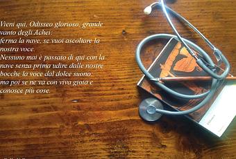 Ieri mattina ho tenuto un breve intervento al convegno "Droga e vita quotidiana. Dall'agorà a internet" presso il centro convegni "Marani" a Verona (a chi interessa qui sopra ho messo il testo pubblicato su un giornale locale). In questo periodo mi sto attrezzando per presentarmi ai convegni con delle slide mentre, solitamente, tendo a lasciarmi semplicemente trascinare dalla mia passione per i libri e declamare il sacro fuoco della letteratura che mi anima. Il tempo per le slide non l'ho avuto, solo il minimo a permettermi di creare una singola immagine per presentarmi, che è quella che vedete. Vi chiederete se è stata adeguata alla situazione, dato che è un prodotto artigianale fatto con libro, fonendoscopio e penna di mia propietà, messe sulla mia scrivania. La risposta è emplice: il proiettore non funzionava e la mia slide è rimasta nella pen-drive. Sarà un segno del destino che mi dice di non incaponirmi con la tecnologia, ma di lasciare alle parole il compito di diffondere la Biblioterapia?