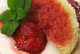 Una golosa ricetta di semifreddo di camomilla servito in bicchiere con ricco pan di spagna alle erbe e salsa di fragole pochèes e melissa.