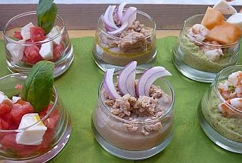 Bicchierino con crema di zucchine e spiedino di gamberi, melone e fiordilatteIngredienti per 6 persone: