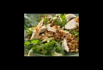 · 300 g di petto di pollo · 40 g di olio extravergine di oliva · sale q.b. · pepe nero macinato q.b. · 1000 g di acqua · 250 g di farro perlato · 40 g di mandorle pelate · 1 mazzetto di rucola, tagliata a pezzetti · 20 g di pinoli · 1 limone.