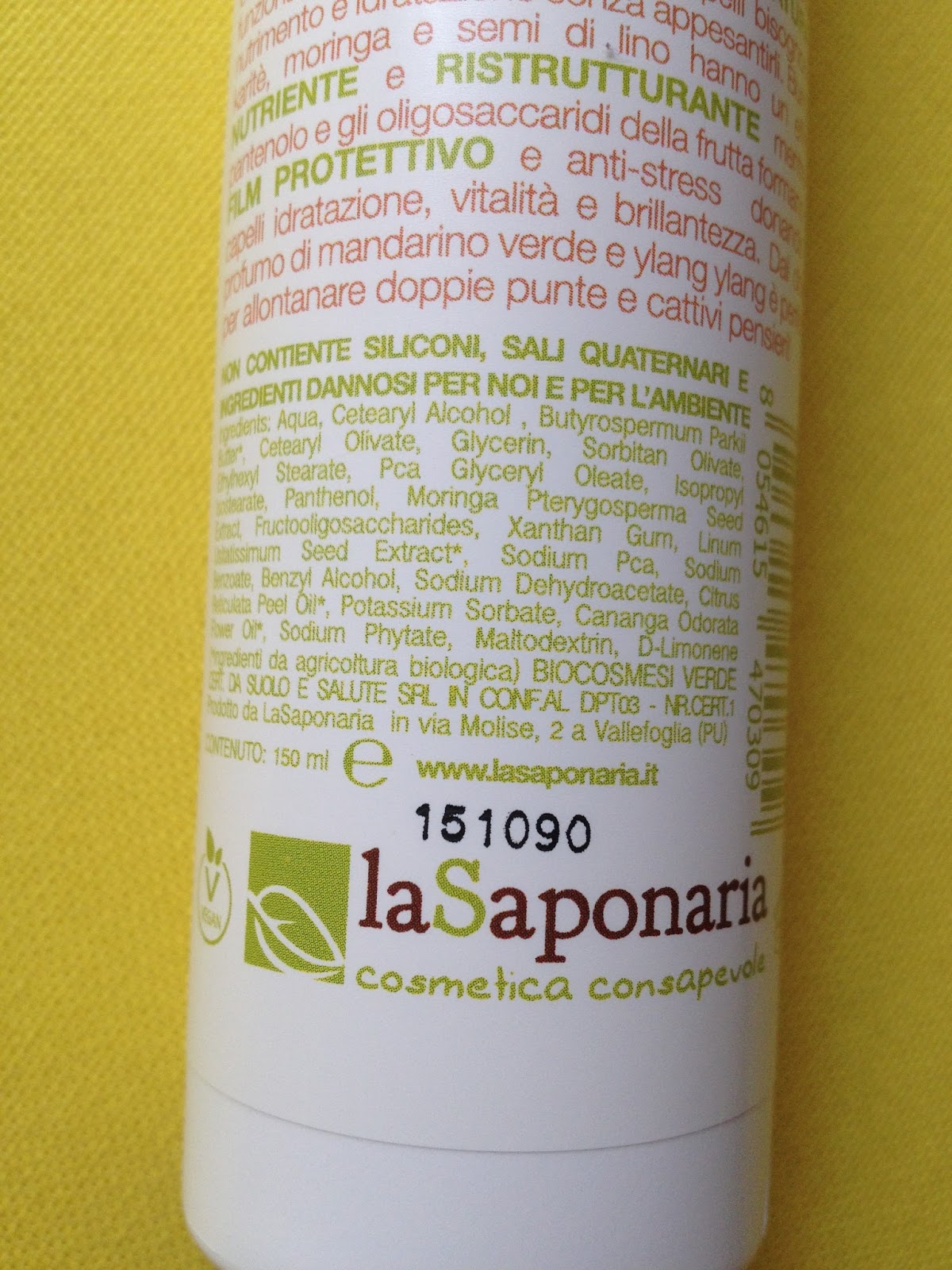 La confezione costa circa 7€ ed è da 150ml - un formato un po' più piccolo del solito, in genere i balsami si trovano più frequentemente da 200ml - ed è un semplice ma funzionale flacone di plastica bianca con apertura a scatto e forellino dosatore. Recentemente l'azienda ha fatto un restyling dell'etichetta - potete vederne il nuovo aspetto sul sito aziendale - quella in mio possesso è, appunto, la confezione "vecchia".