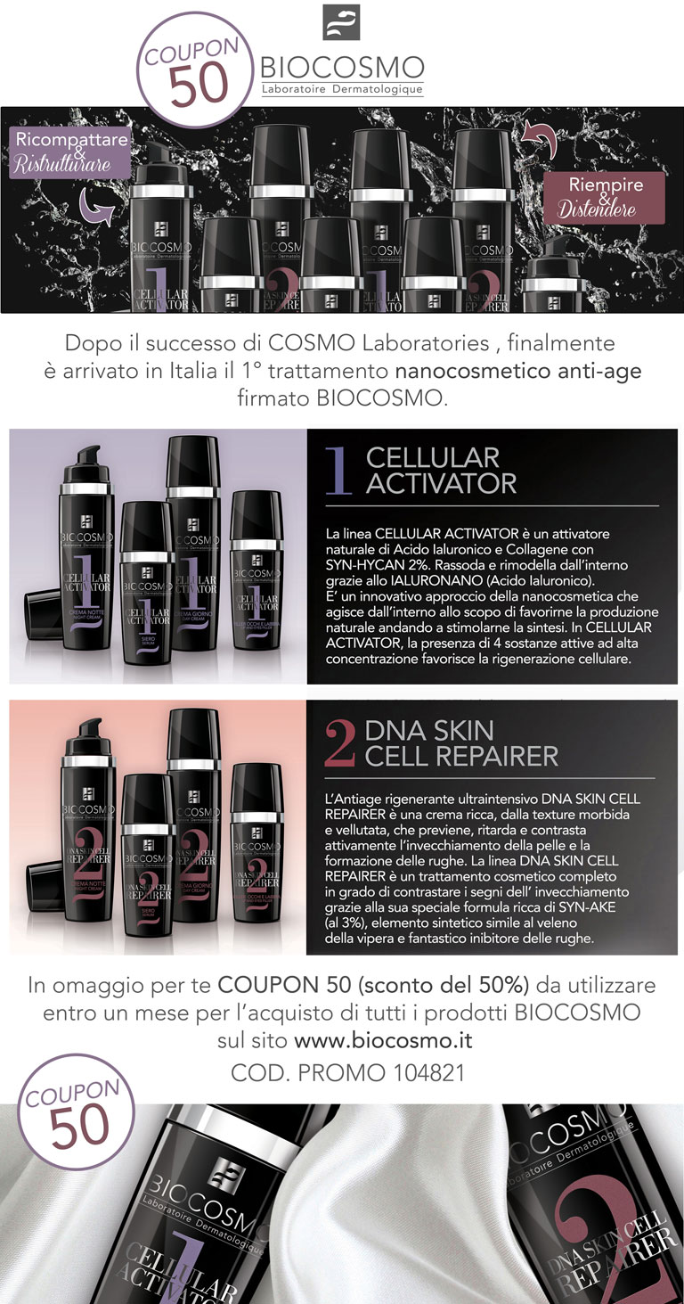 Per voi followers la possibilità di acquistare i prodotti Biocosmo direttamente sul sito www.biocosmo.it con uno sconto del 50% grazie a COUPON 50,
