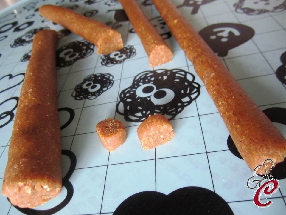 Riprendetelo e dividete l'impasto in 4 parti. Ricavate da ciascuna di queste un cilindro del diametro di un paio di centimetri.Con un coltello ben affilato tagliate dei bottoncini spessi circa un centimetro.