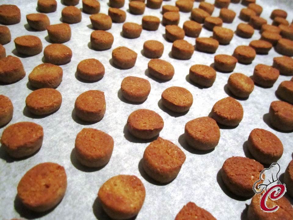 Sistemate i biscottini ottenuti su una teglia ricoperta da carta forno, premendo leggermente al centro con il polpastrello.