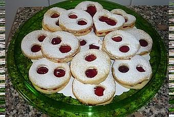 Quando i biscotti si sono coloriti togliete dal forno e procedete con la farcitura. Spalmate la marmellata sulla sagoma non incisa (quella piena) e sovrapponetevi quella incisa (vuota o forata) dopo averla spolverizzata con dello zucchero a velo.