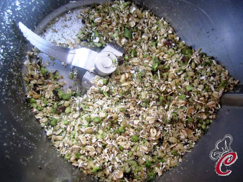 Inserite in un boccale pistacchi, noci e fiocchi d'avena. Tritateli grossolanamente, quindi teneteli da parte.