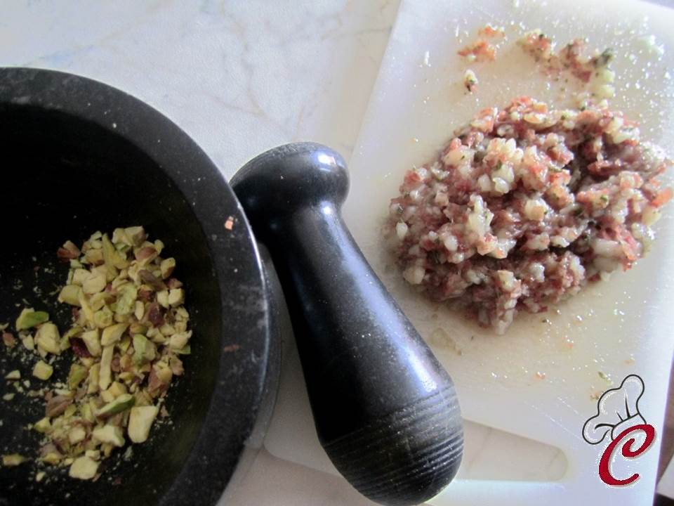 Per la farcitura1/2 melanzana viola 2 rametti di salvia30 g di bresaola10 g di pistacchi tostatisale rosa dell'Himalaya