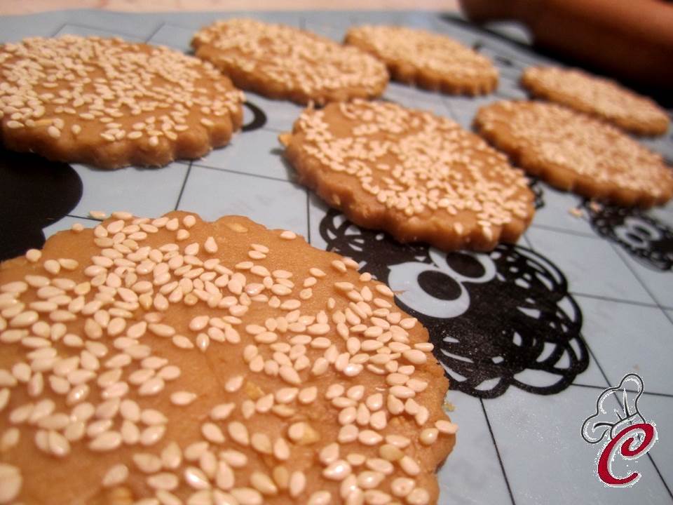 Stendetelo in una sfoglia spessa circa mezzo centimetro e ritagliate i biscotti della forma desiderata. Sistemate metà dei biscotti ottenuti su una teglia coperta da carta forno. La metà rimasta passatela sui semi di sesamo, rovesciati su un piano.