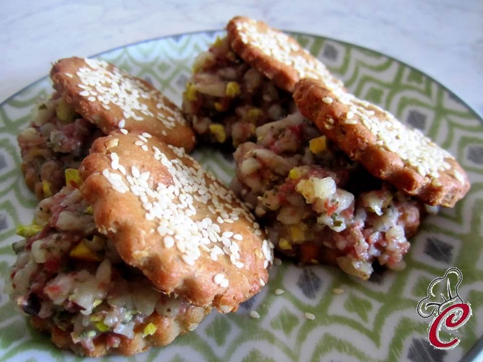 Tagliate la melanzana in due e tenetene una sola parte. Praticate dei tagli lungitudinali, salate e inserite nei tagli le foglie della salvia, lavate e spezzettate. Fate cuocere a vapore o in forno, fino a qundo sarà morbida (io non eccedo mai con i tempi di cottura!!).Prelevate la polpa della melanzata e tritatela, con la mezzaluna, insieme alla bresaola. Sgusciate i pistacchi e pestateli in un mortaio, ottenendo una granella irregolare e piuttosto spessa, quindi uniteli alla crema di melanzana. Mescolate e assaggiate che sia sufficientemente sapida. La bresaola dà molto sapore.Adesso prendete il numero desiderato di biscotti senza semi di sesamo (con questa quantità riuscirete a farcire circa 6 biscotti, per cui ve ne serviranno in tutti 12). Sistemate su ciascuno di questi un cucchiaio di crema e coprite con un biscotto con i semi di sesamo in sperficie.