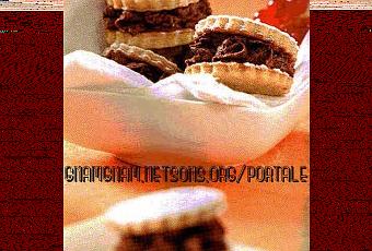 - Fondete il cioccolato a bagnomaria e appena e’ tiepido incorporatelo alla panna montata. Amalgamate bene la crema. Farcite i biscottini ormai freddi con la mousse di cioccolato e serviteli spolverizzati di zucchero a velo.