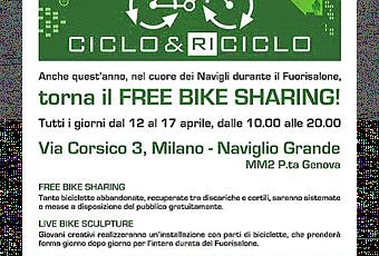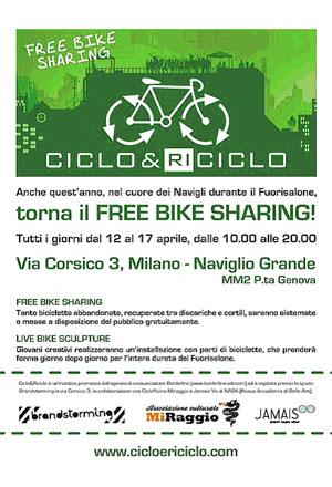 La tematica green è sempre molto calda con eventi come il Milano Green Festival 2011 e Green Island in zona isola. La bicicletta diventa l'oggetto culto di questa edizione 2011 del "Fuorisalone" con alcuni eventi dedicati. Vi segnaliamo Ciclo&Riciclo, un free bike sharing sui navigli con un istallazione fatta di componenti di biciclette creata ad hoc dal team JAMAIS VU di NABA. Un progetto che raggruppa diverse realtà impegnate nella creazione di oggetti e servizi eco-friendly. Hai voluto la bicicletta...pedala!!! ...tutti i giorni dal 12 al 17 aprile, dalle 10.00 alle 20.00, tante biciclette abbandonate e recuperate, saranno messe a disposizione del pubblico, gratuitamente.