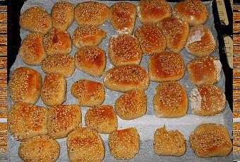 Sciogliere il lievito nel latte e nell'acqua con il miele e l'olio. Aggiungere le farine già miscelate tra loro e per un ultimo il sale. Impastare bene fino ad ottenere una pasta che non s'attacca più alle dita; formare un pane, tagliarlo nele senso della lunghezza e mettere a lievitare sotto un panno umido almeno due ore. Riprendere la pasta e formare i bocconcini tagliandola a piacere a pezzetti della grandezza voluta, ungere leggermente e ricoprire con il sesamo. Far lievitare ancora un ora e cuocere in forno già caldo a 200° C per una trentina di minuti. Allo stesso modo ho fatto quelli dolci con la variante di aggiungere più miele nell'impasto ed anche sopra, prima di mettere il sesamo. Volendo si può aggiungere anche dell'uvetta.