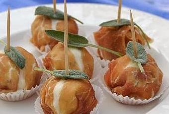 Arrotolatele dentro la fettina di prosciutto crudo, inserite ciascun bocconcino in un pirottino per muffin e completate con uno stuzzicadenti, tenete in frigorifero per 1 ora circa e servite i bocconcini come antipasto.