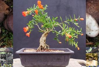 Il bonsai melograno si presenta con fiori solitari e raggruppati a grappoli nei rami più giovani e con foglie opposte, lisce e dal colore verde brillante. I fiori sono ermafroditi, di colore rosso oppure arancione. I frutti del bonsai melograno si chiamano “balauste” e sono delle bacche grandi di forma sferica. All’interno, i frutti contengono dei grani con polpa trasparente e succosa e dei semi di colore bianco. Il tronco del bonsai melograno si presenta con corteccia di colore marrone-grigio e con una forma contorta che ne accresce notevolmente la resa ornamentale.