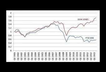 meno costante dopo il crollo del 2008, ha ricominciato a scendere rapidamente, nove cali consecutivi. Di fatto, la ricchezza italiana è la stessa della primavera 2000, una sfida aperta al principio di base del capitalismo, la crescita.