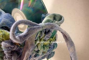 In realtà per oggi vi mostro solo un assaggio, diciamo un'anteprima, di ciò che porterò a Florence Creativity.Uno scorcio, un piccolo particolare, di una piccola borsettina fatta con due cd uniti da una fettuccia riciclosa, ricavata da una T-shirt.