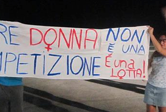 “Ieri il lungomare liberato di Napoli è stato purtroppo teatro della serata Miss Napoli (selezione per Miss italia). Sponsorizzata tra l’altro da Silvian Heach, famosa per le sue campagne sessiste. Abbiamo protestato con uno striscione che diceva “Essere donna non è una competizione, è una lotta!!!” e abbiamo raccolto molti consensi, la gente si fermava a guardare e diverse donne si sono complimentate e ci hanno detto “Siamo con voi!”. Non se ne può più di un concorso vecchio più di 70 anni e anacronistico, fatto per assegnare “la mela alla più bella” secondo canoni imposti che non ci appartengono, che chiude le donne in un ruolo decorativo sotto uno sguardo reificante. Una noiosa manifestazione di violenza simbolica di un paese profondamente misogino, in cui si spendono soldi per cose di questo tipo, mentre se ne tagliano ai centri antiviolenza, ai consultori, ai servizi sociali, il lavoro, quando c’è, è sempre più precario e senza diritti e manca totalmente una politica di prevenzione della violenza di genere. Patrizia Mirigliani, Silvian Heach e gli altri organizzatori possono stare tranquilli, che ce l’avevamo proprio con loro e non con le ragazze, che sono nostre sorelle! Lo abbiamo precisato tra le altre cose anche in un’intervista a Canale 8, che era lì presente a riprendere l’evento. La protesta è stata fotografata anche da Claudio Morelli che si sta documentando per un’inchiesta-parodia sui concorsi di bellezza e che scrive su IL mensile del Sole 24 ore.”
