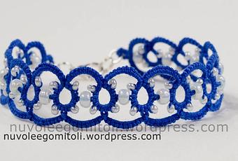 Il motivo è nato dopo un pomeriggio di gioco con le navette, in cui cercavo di mettere a punto una piccola bordura. Le perline hanno fatto il resto. Comunque... per questo leggero bijoux ho scelto un cotone di colore blu elettrico perché mi piace la carica, letteralmente la "scossa" che questo colore sa trasmettermi. L'ho abbinato - era inevitabile - a perline in vetro bianche/avorio di due misure diverse: