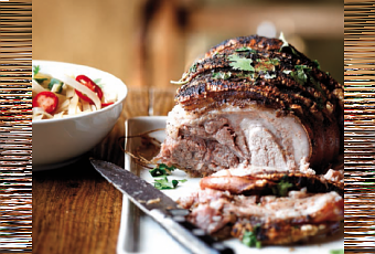 Incidere il grasso del maiale. Disporre la spalla in una teglia da forno profonda e ricoprire con acqua bollente. Questo accorgimento servirà a dare una consistenza croccante. Scolare e asciugare. Montare il Tritatutto, versarvi le stelle di anice e i semi di finocchio. Macinarli e aggiungere il cerfoglio, il peperoncino in polvere e il sale. Ricoprire il maiale con questa miscela. Lasciare a riposare in frigorifero durante la notte senza coprire. Riscaldare il forno a 220°C. Scaldare il brodo, versarlo nella teglia sopra la carne e lasciare cuocere in forno per 20 minuti. Abbassare la temperatura del forno a 160°C e continuare la cottura per altri 140 minuti. Togliere dal forno e fare raffreddare. Riscaldare il grill a media temperatura e cuocere la carne finché sulla pelle del maiale inizieranno a formarsi delle bollicine. Per preparare gli spaghetti di riso: versarli in un recipiente largo e ricoprirli con acqua bollente. Coprire e lasciate riposare per 10 minuti. Scolare l’acqua e aggiungere la salsa chili e la salsa di soia. Mescolare accuratamente e cospargere con peperoncino e cipollotti affettati. Tagliare la carne, disporla su un vassoio da portata insieme.