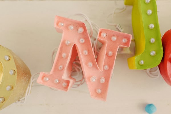 materiale occorrenteForbici, Colla rapida trasparente per la carta, Nastro adesivo elasticoCutter,Bombolette spray colorate,Cartoncino, Matita.Foratrice per la carta Righello,Filo di Luci1: Disegnate in modo perfetto, utilizzando il righello o la squadra, le lettere che volete realizzare;2: Ritagliate le lettere con le forbici e con il cutter per gli angoli più difficili;3: Praticate con la foratrice i buchi per le lucine in modo simmetrico;4: Realizzate con il cartoncino di 3/4 cm delle strisce per il contorno;5: Applicatele con la colla aiutandovi con il nastro adesivo;6: Colorate con lo spry le lettere secondo il vostro gusto;7: Infine sistemate le lucine in ogni foro e bloccatele con lo scotch.Se volete risparmiare del tempo, utilizzate i cartoncini colorati.material neededScissors, Quick Dry Tacky Glue,X-acto Knife, Whole Punch, Cardstock, Free Template,Ruler, Mini Globe Lights1: Draw in a perfect way, using the ruler, the letters you want to accomplish;2: Cut out the letters with scissors and with the cutter, for hard to reach areas;3: Practice the holes for the lights in a symmetrical manner;4: Made a 3/4 cm strips of paper for garnish;5: Apply them with glue helping with adhesive tape;6: Colored the letters according to your taste;7: Finally put the lights into the letters and plug in!