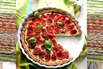 7. Spalmiano il tofu al basilico sulla brisè e completiamo con pomodorini tagliati a metà, sale, pepe, una spolverata di basilico secco e origano