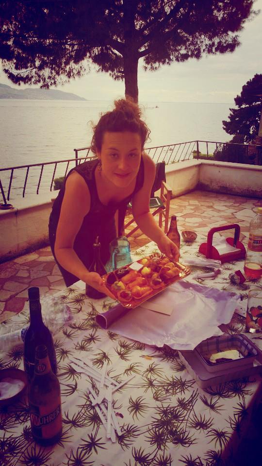 - polpettine melanzane con la menta (questa volta l'impasto è venuto PERFETTO) con sugo di pomodoro a parte- uova sode con pomodori a mo di funghetti (la decorazione con la maionese è venuta uno schifo, ma non per colpa mia!)- perini ripieni con crema di tonno e maionese- torta salata zucchine, patata e speck- torta salata piselli e prosciutto- 2 tipi di pasta fredda- patatine (non possono mancare) 3 tipi- torta al limone a cubetti- torta al cioccolato a cubetti- the freddo alla pesca- spremuta- succo d'ananas- birre - vinoDopo qualche ora salamine e würstel alla piastra (senza panini perché te li sei dimenticata!) e spritz aperol.Alla fine pasticcini offerti da un amico di Milano e torta Maderno (la torta più buona dell'universo).Il tempo è stato clemente, soprattutto considerando lo schifo dei giorni precedenti. Sei soddisfatta.Momenti di risate e relax per tutti.