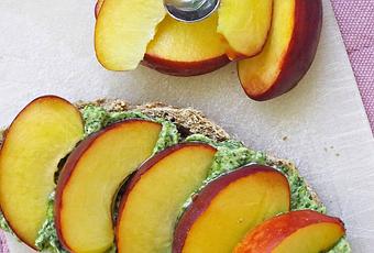 Tostare il pane da entrambi i lati. Frullare finemente la rucola con il caprino. Lavare la pesca e tagliarla a fette sottili.Spalmare le fette di pane con la crema di formaggio e disporre ordinatamente le fettine di pesca sulla superficie. Completare con un filo di miele.Servire come aperitivo abbinato a fresche bollicine!
