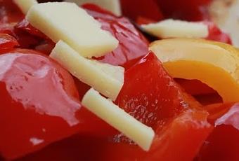 Preparazione Lavare i peperoni, levare i semini e tagliarli a tocchetti, tagliare a velo la cipolla. In un tegame mettere un filo di olio extravergine d’oliva, aggiungere la cipolla e fare imbiondire, aggiungere poi i peperoni e fare cuocere per una decina di minuti coperti (allungando con qualche cucchiaiata d’acqua tiepida). Quando i peperoni risulteranno teneri levarli dal fuoco, regolare di sale e lasciarli intiepidire. Tostare le fette di pane. Spalmare con un velo di burro all’aglio, aggiungere i peperoni e il formaggio tagliato a scagliette. Passare al grill per un paio di minuti e servire.