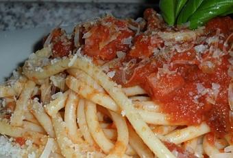 Quando il guanciale è diventato trasparente, ho aggiunto la passata di pomodoro ed ho fatto cuocere per 10 minuti (giusto il tempo di restringere un pochetto); aggiustare di sale.