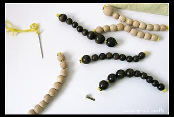 Siamo partiti con la preparazione dei bruchi: quindi, recuperate vecchie perle di legno, messe in fila e contate, Davide le ha infilate utilizzando del filo e un grande ago la maglia.