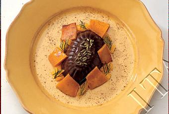 - Intanto pelate a vivo l’arancia, ricavando gli spicchi puliti dalle bucce. Sformate i budini sui piatti e serviteli con la zucca, qualche seme di finocchio, ciuffetti di finocchietto, gli spicchi di arancia e una spolverata di cannella.