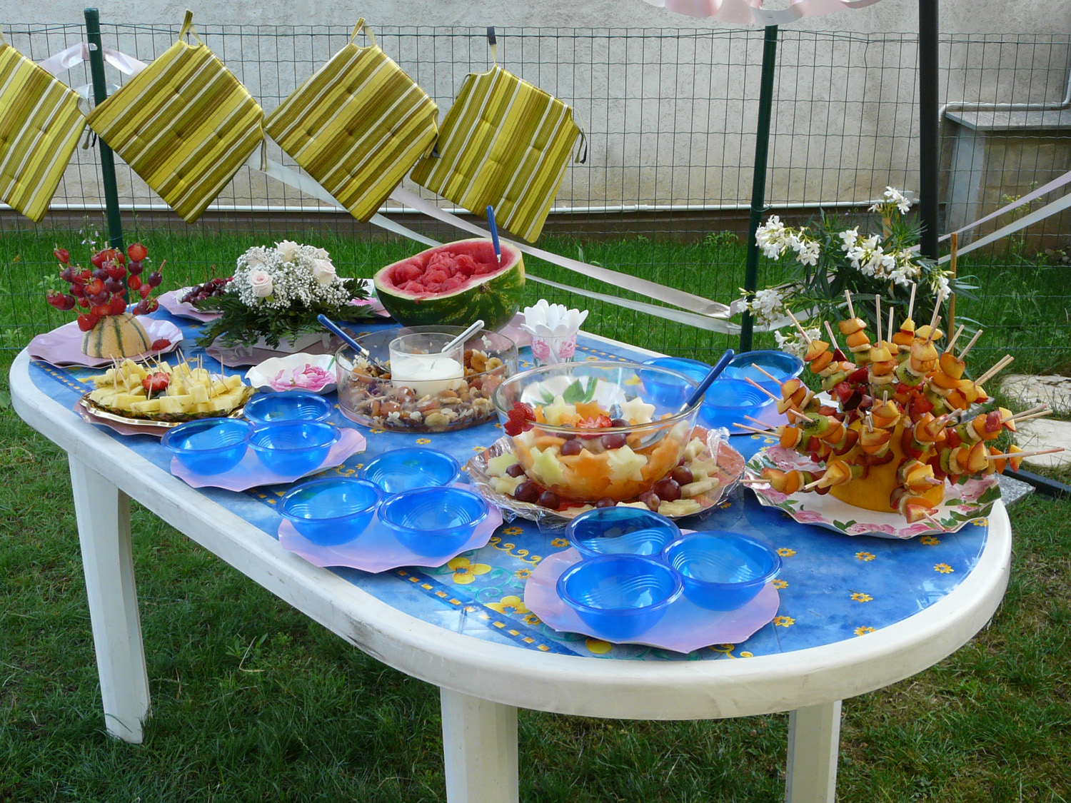 Uno dei tavoli da buffet con al centro un contenitore trasparente con frutta secca tra cui mandorle, albicocche, banane e uvetta da servire con yogurt greco freschissimo.
