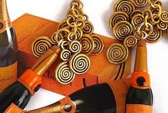 Un brindisi per le feste con questi orecchini dorati con miniatura di bottiglia di champagne Veuve Clicquot e cascata di ciondoli a spirale per ricordare le bollicine; gancio ad amo