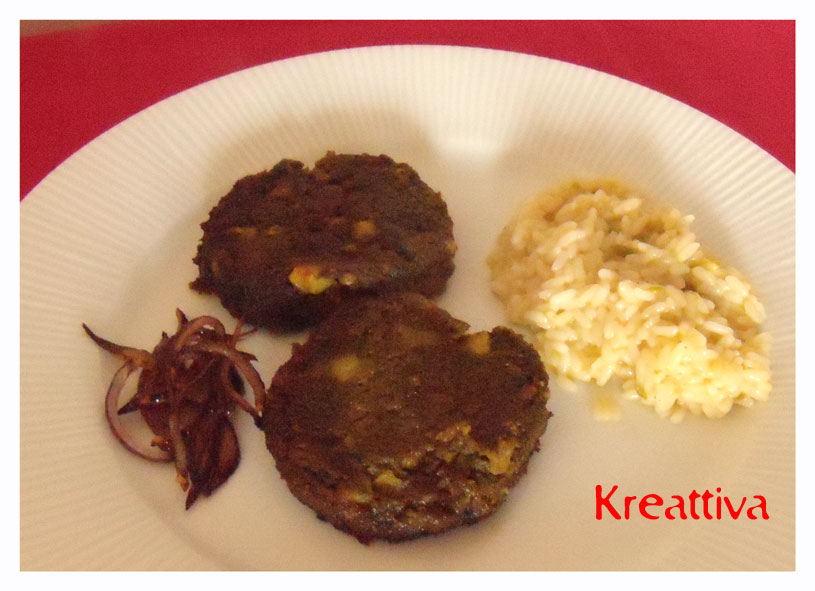 Cuocere i burger di spinaci bioappetì per 5 minuti e servire insieme alla cipolla e il risotto