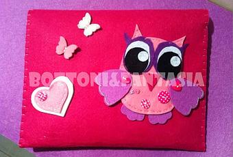 Mamma Erika mi ha chiesto per la sua piccina Giulia una busta porta-pannolini da mettere nella borsa del cambio. Voleva i colori tipici per una bimba, fuxia, lilla e rosa e anche un gufetto. Ed io ho cercato di accontentarla realizzando questa busta tutta fuxia con un gufetto rosa e lilla, qualche farfallina e un po' di glitter per dare un tocco di "femminilità" a questa creazione. La busta viene chiusa sul fronte con due automatici ricoperti da due fiorellini e bottoni fuxia a pois bianchi; internamente è invece completamente foderata in tessuto di cotone rosa a pois bianchi.A Giulia e alla sua mammaCon affettoSilvia