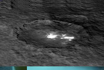 Un’immagine del cratere Occator su un modello digitale del terreno offre una vista prospettica in 3-D-simile della struttura dell’impatto. Diverse aree luminose possono essere visibili in questo cratere. La parte interna del cratere misura circa 10 chilometri di diametro e mezzo chilometro in profondità. Il crater Occator misura a circa 90 chilometri di larghezza.