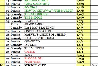 Scendono, invece, Shark Tank, Fresh Off The Boat, Dr. Ken, 20/20 e Nashville. In particolare Nashville è ormai stabile in fondo, il che rende sempre più probabile una sua cancellazione a fine stagione.