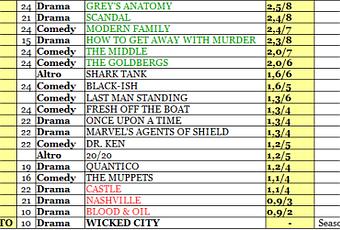 Piccole gioie, invece, per i rialzi di Last Man Standing, 20/20 e Blood & Oil – c’è una certa stabilità nel suo andare male. Pareggi per Marvel’s Agents of S.H.I.E.L.D. e Dr. Ken, mentre tutto il resto è disgraziatamente in calo.