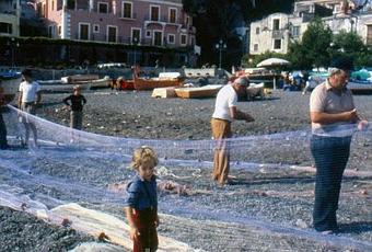 mio figlio che scorrazzava sulla spiaggia tra le reti dei pescatori
