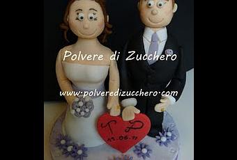 Cake Topper sposi Tina & PeppeHo realizzato tutto in pasta di zucchero, ispirandomi liberamente a delle foto degli sposi e inserendo dove preferivo il lilla, colore preferito dalla sposa.