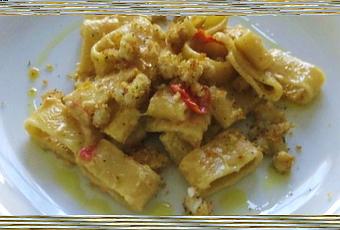 Servire nei piatti la pasta, completando con i dadini di baccala e un filo d’olio.