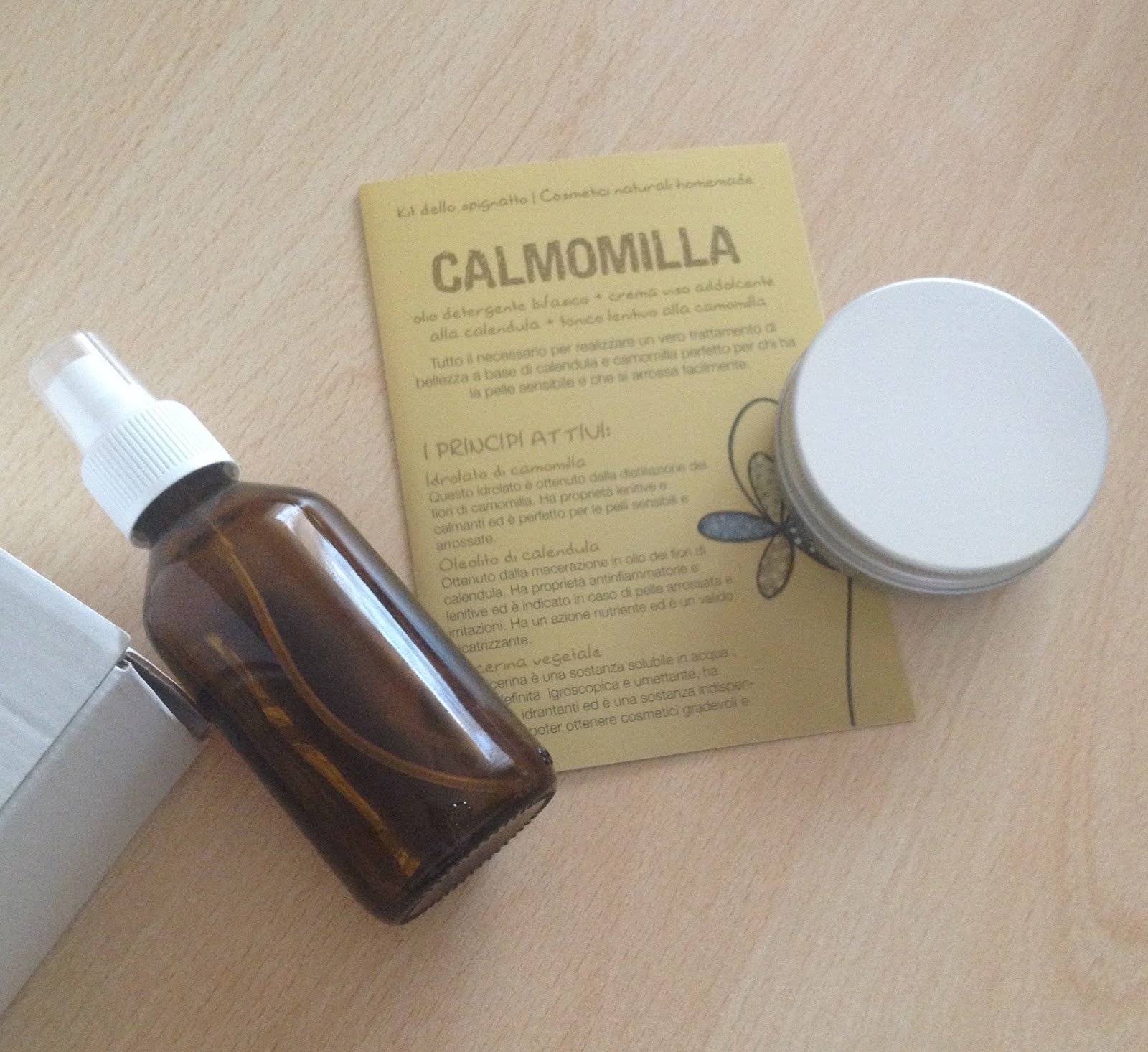 Ma vediamo più da vicino in cosa consiste Calmomilla: contiene tutto il necessario per preparare 3 prodotti a base di calendula e camomilla, ideali, quindi, per chi ha la pelle sensibile o che si arrossa, e ci sono sia gli ingredienti/materie prime che i contenitori necessari, oltre a una brochure con tutte le istruzioni e le indicazioni per realizzare i nostri cosmetici fai-da-te.