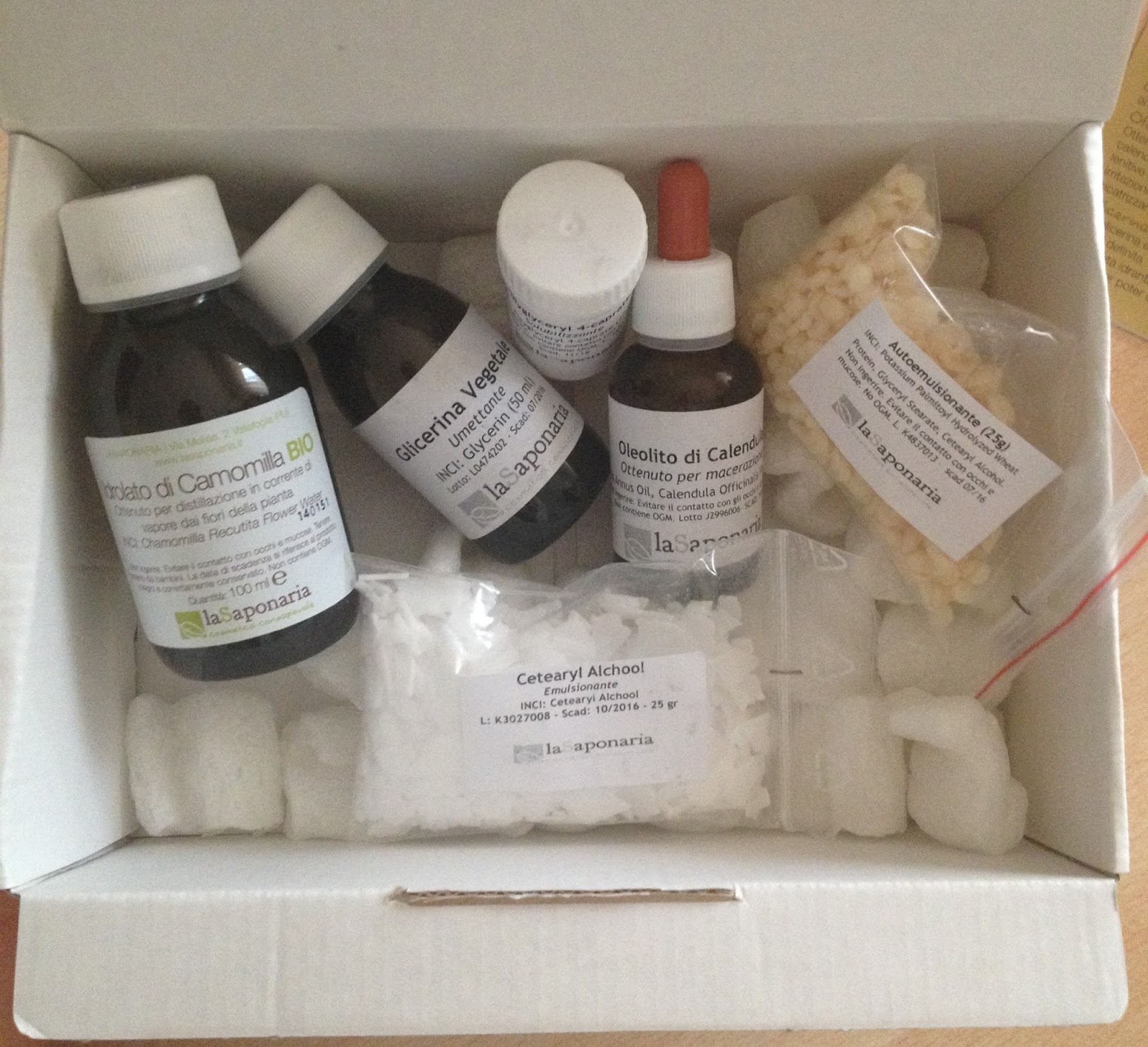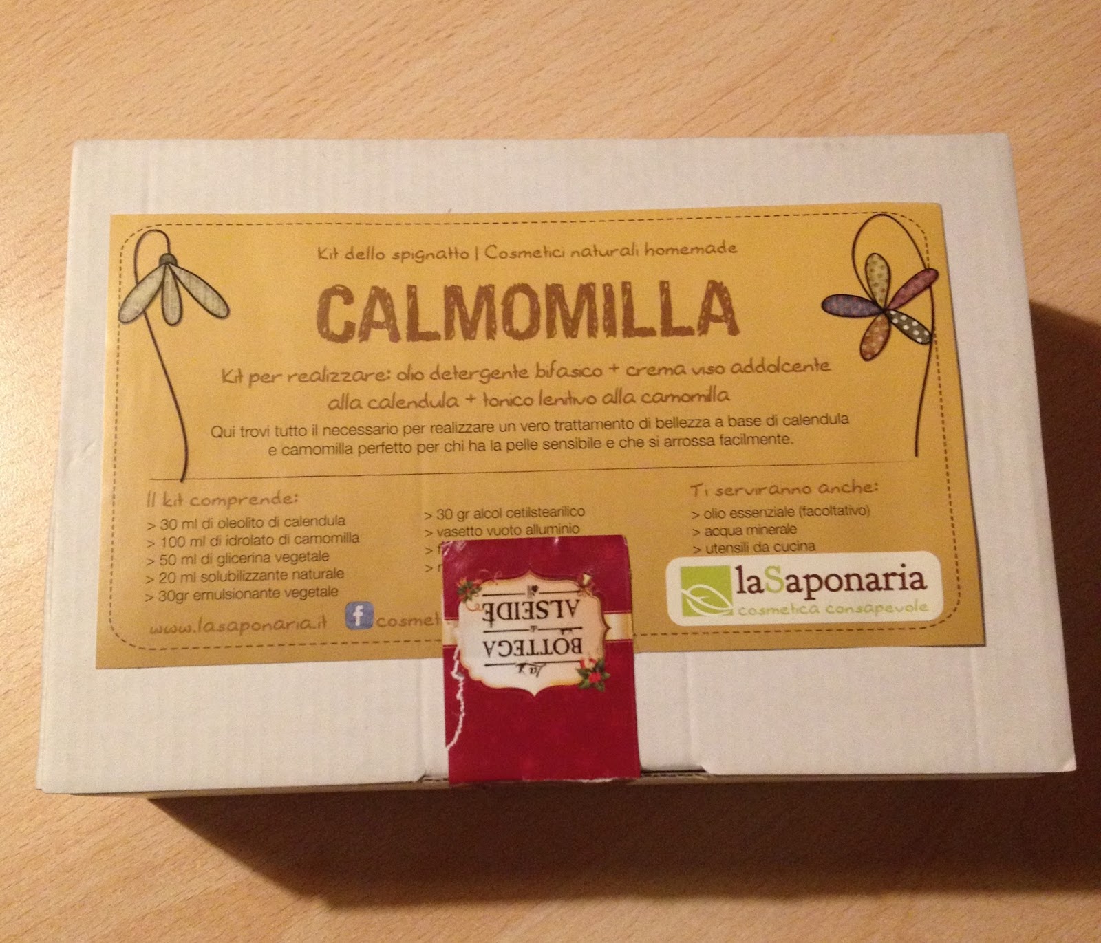Si tratta di Calmomilla, uno dei vari kit di autoproduzione e basi cosmetiche proposto da La Saponaria, per cimentarsi in casa nello spignatto di semplici cosmetici naturali. Ammetto di non aver mai spignattato nulla, non ne ho mai avuto il coraggio, la capacità, le conoscenze nè la strumentazione adatta, e devo dire che questi kit sono ideali per un approccio a questo "mondo" anche a chi vi è assolutamente estraneo, come la sottoscritta.