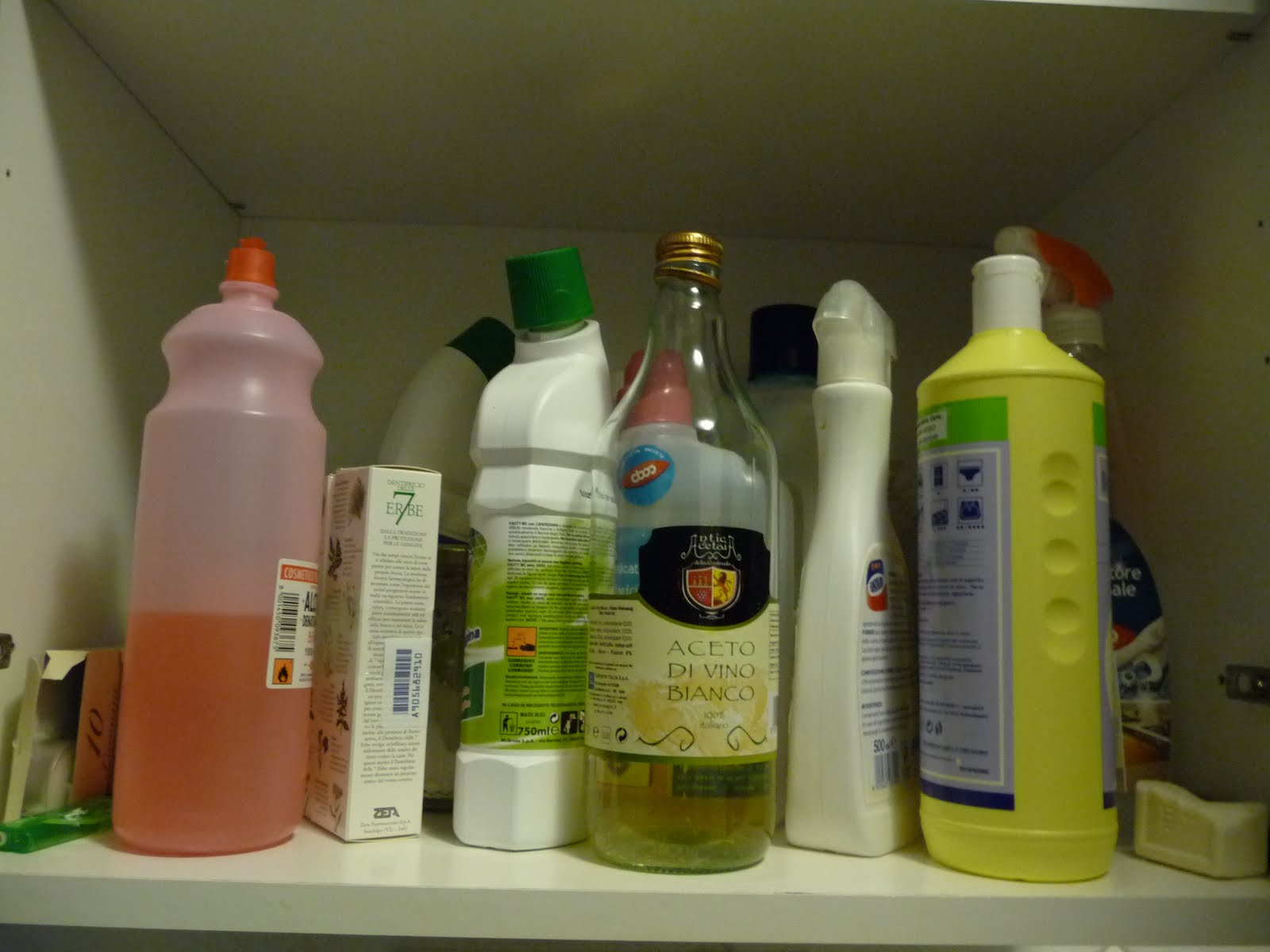 Ora nel mio armadietto per le pulizie ci sono "solo":aceto biancobicarbonatosapone di marsiglia (puro e vegetale)noci del sapone (in sperimentazione)olio di tea tree (Melaleuca alternifolia)olio essenziale di lavandaalcool (fino ad esaurimento).